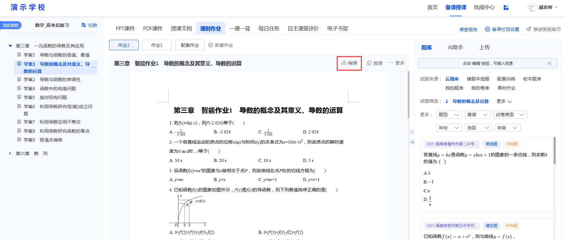 系统为每个课时配置了对应的配套作业,老师在备课时可提前预览作业内容。同时点击【编辑】按钮复制生成一份在线文档,可对题目进行调整,并制作一份新的答题卡供学生练习