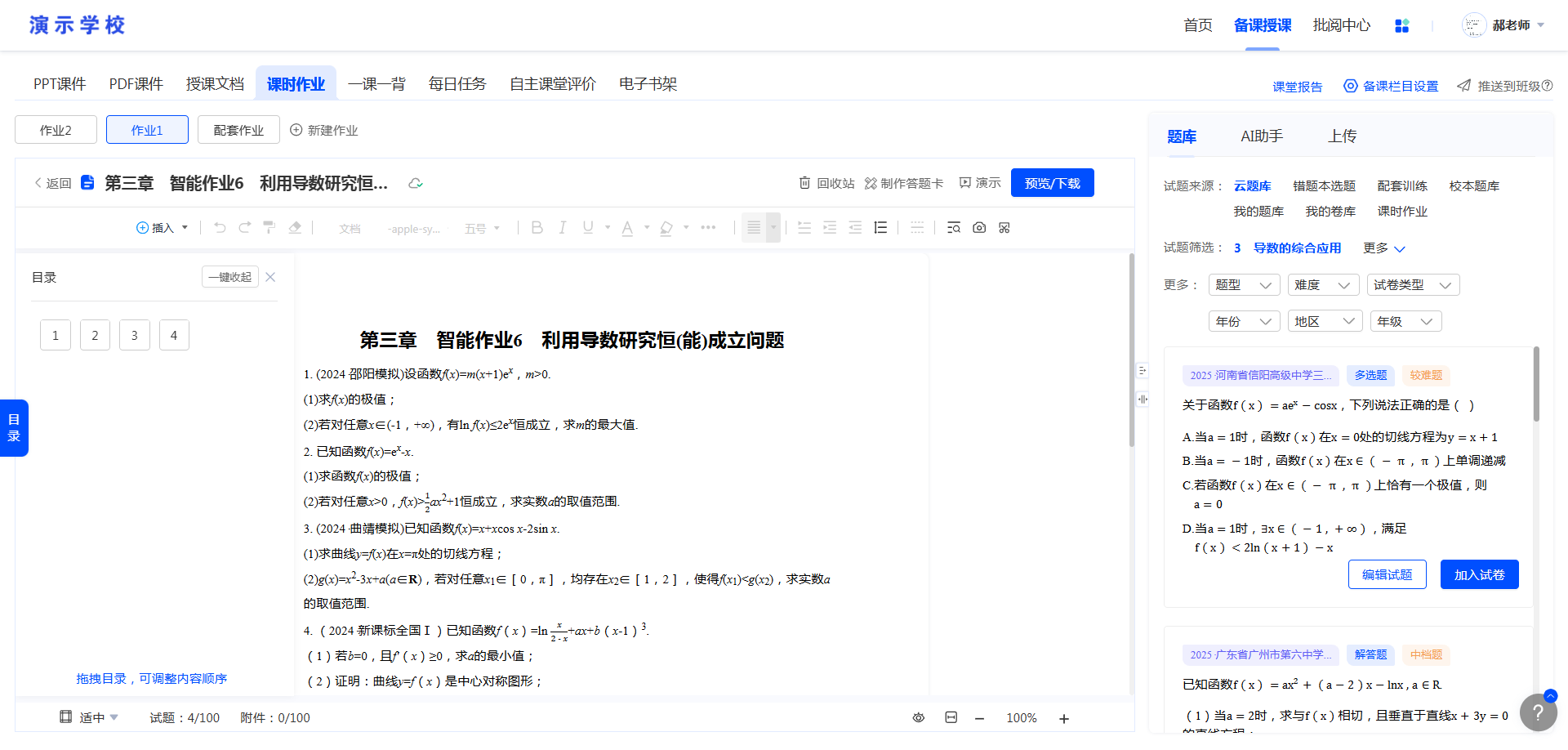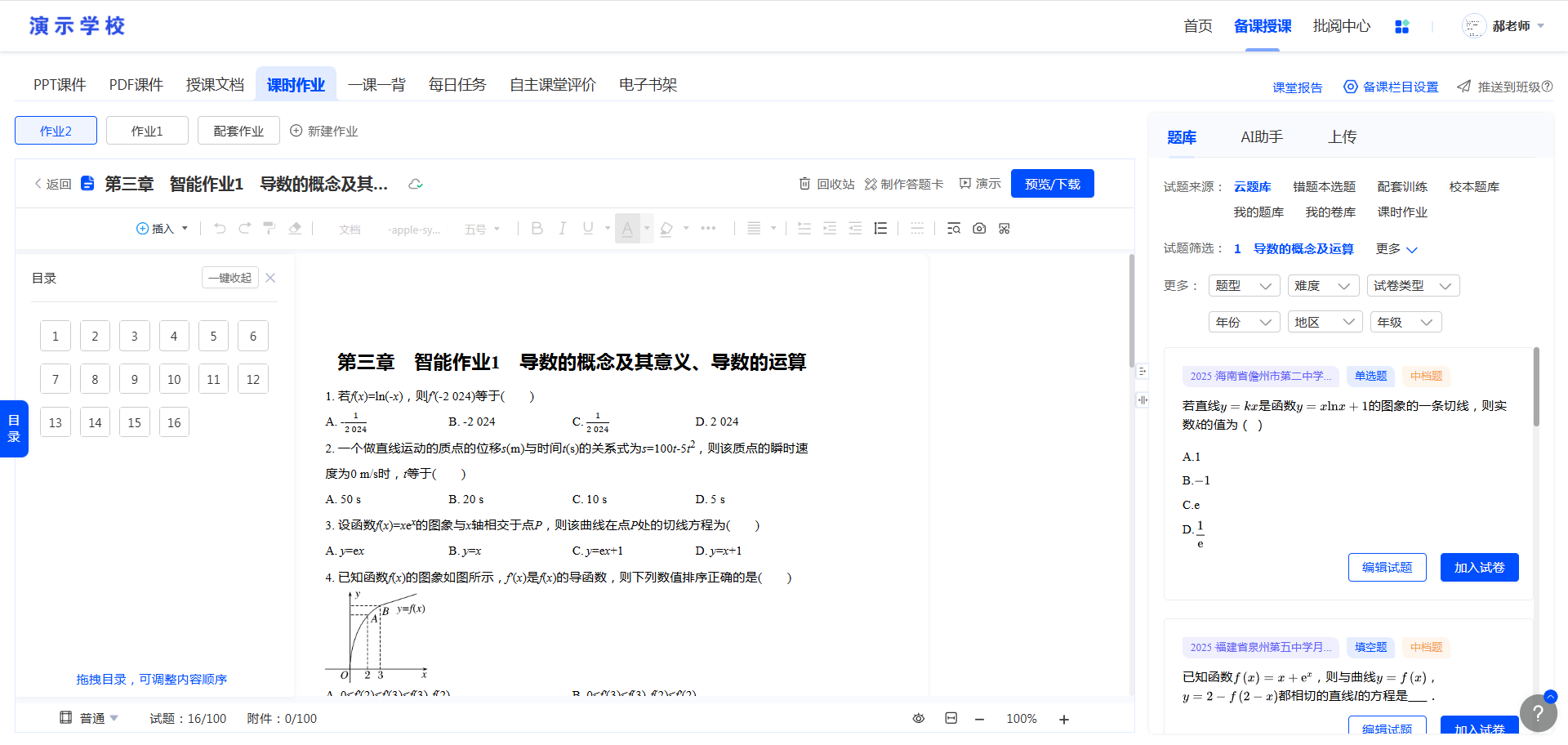 可从右边题库、AI助手、上传模块中选择自己需要的题目或资源添加到左边的试卷预览页面。