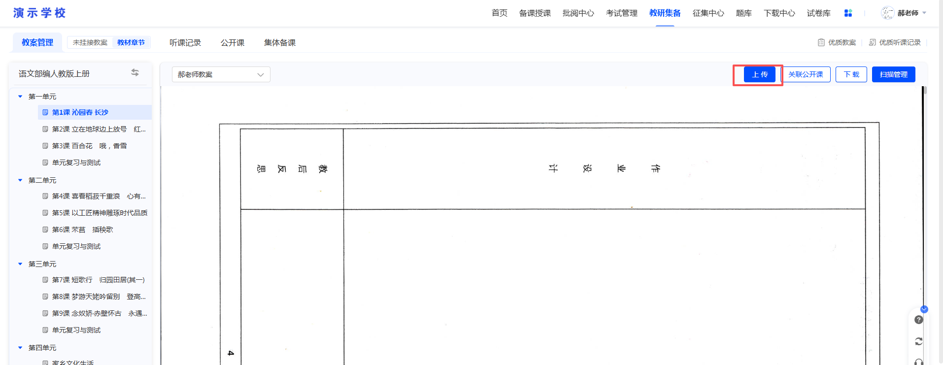 完成教案填写后,老师需在扫描仪面板新教育客户端上选择教研-教案。