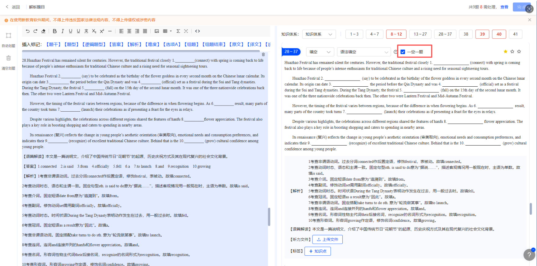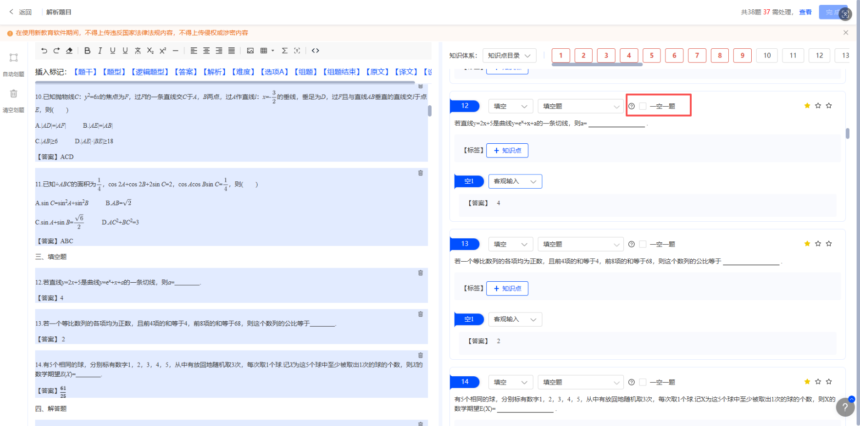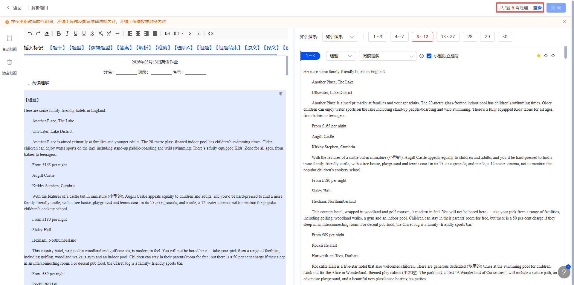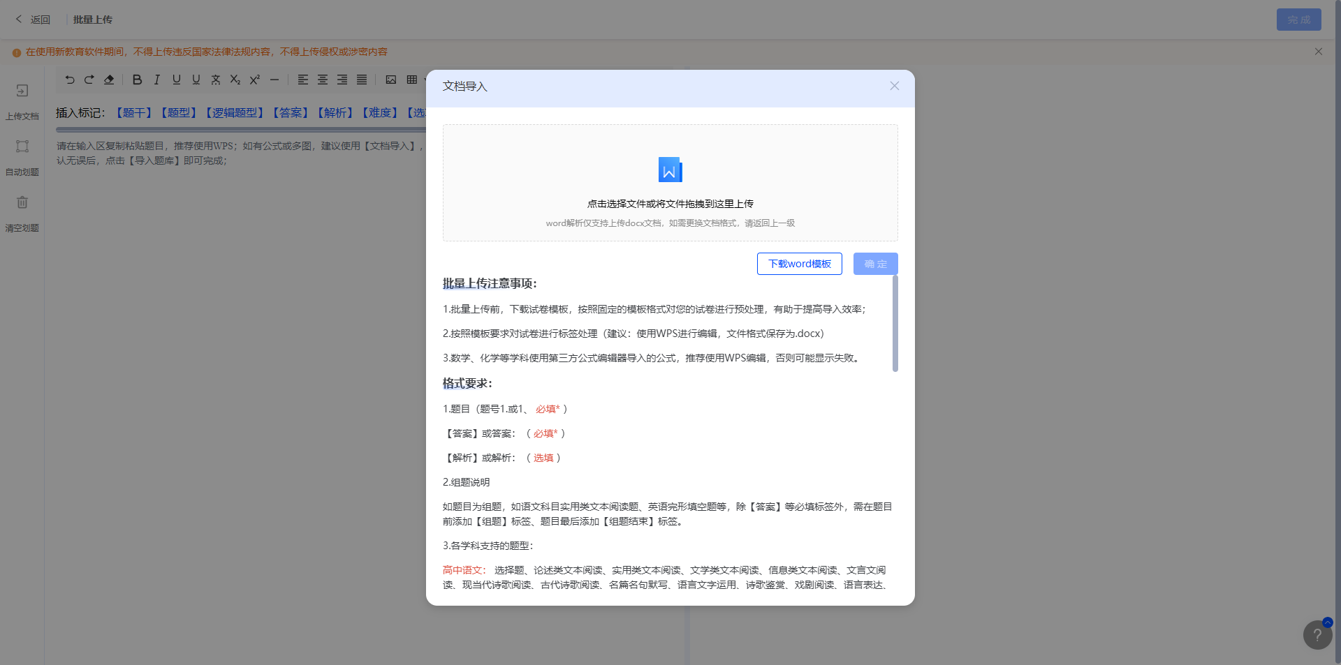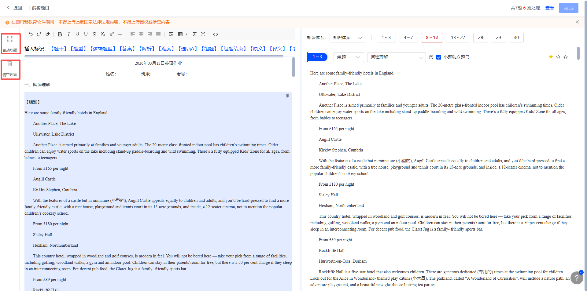 上传后系统会自动解析题目进行题目划分,如果有组合题,可先点击【清空划题】后,插入对应标记后再次点击【自动划题】。