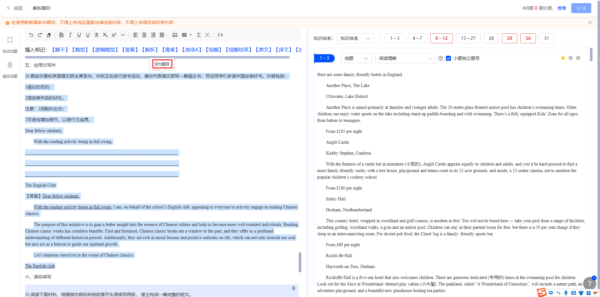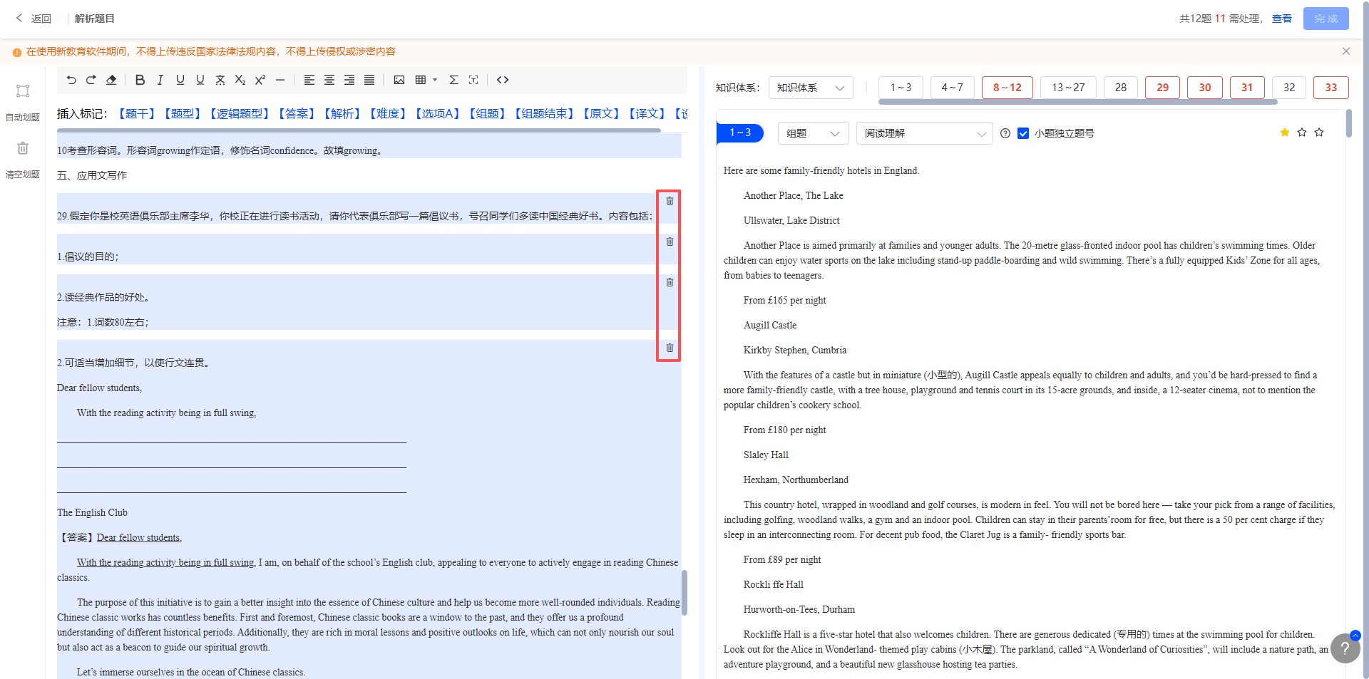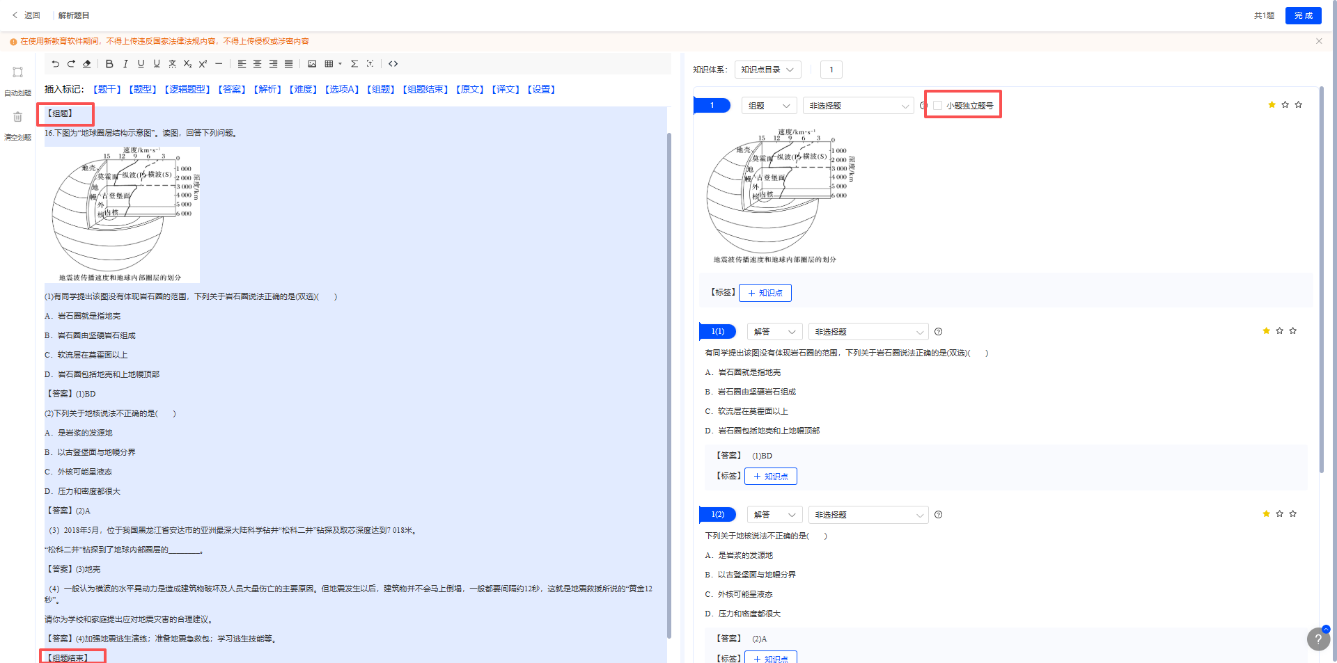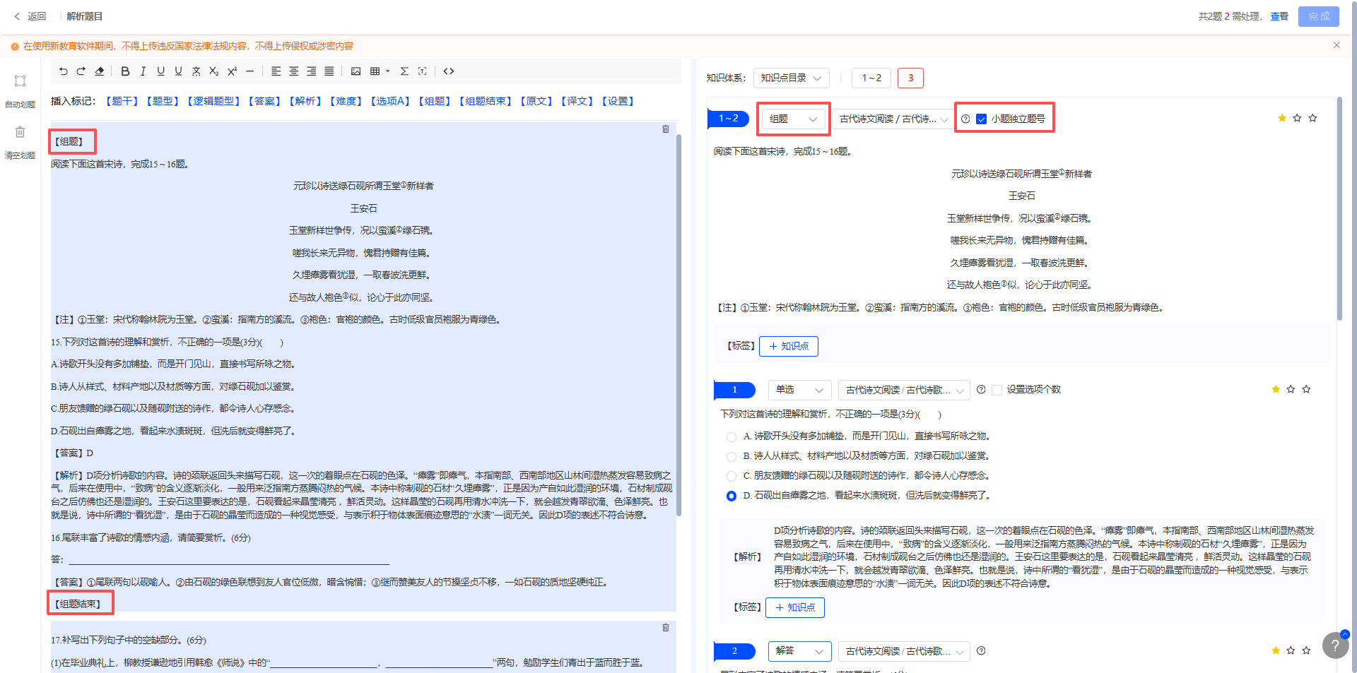 如语文科目现代文阅读题、英语科目完形填空题等,除题目、答案等必填标签外,需在组题题文前添加【组题】标签、题目最后添加【组题结束】标签,