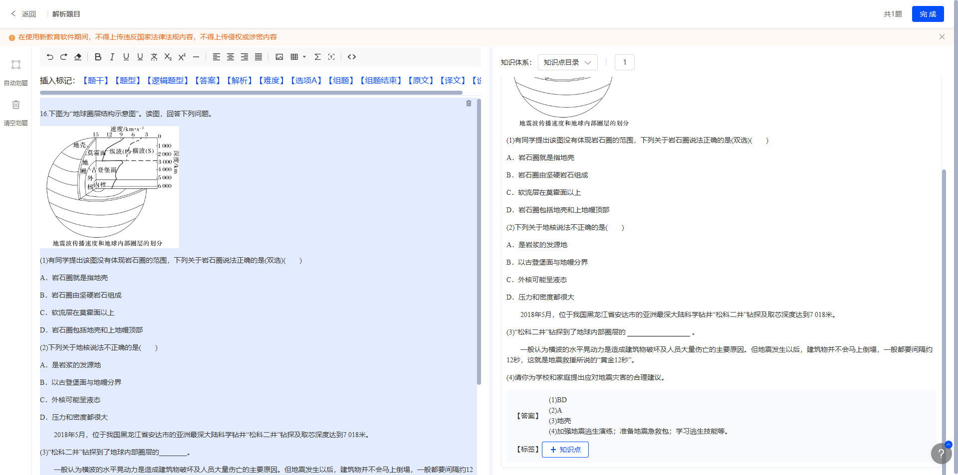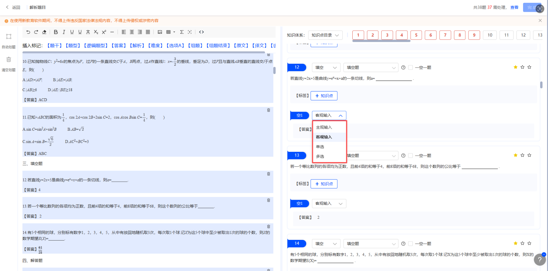 2.完善题目信息:根据题型,补充完整题目内容,包含题干、选项、答案等;