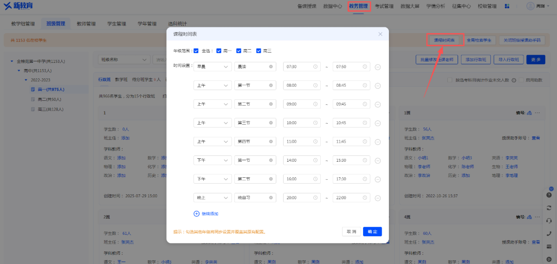 学校管理员、校长、副校长、教务主任角色,可通过班级管理分别给不同年级设置课程时间。