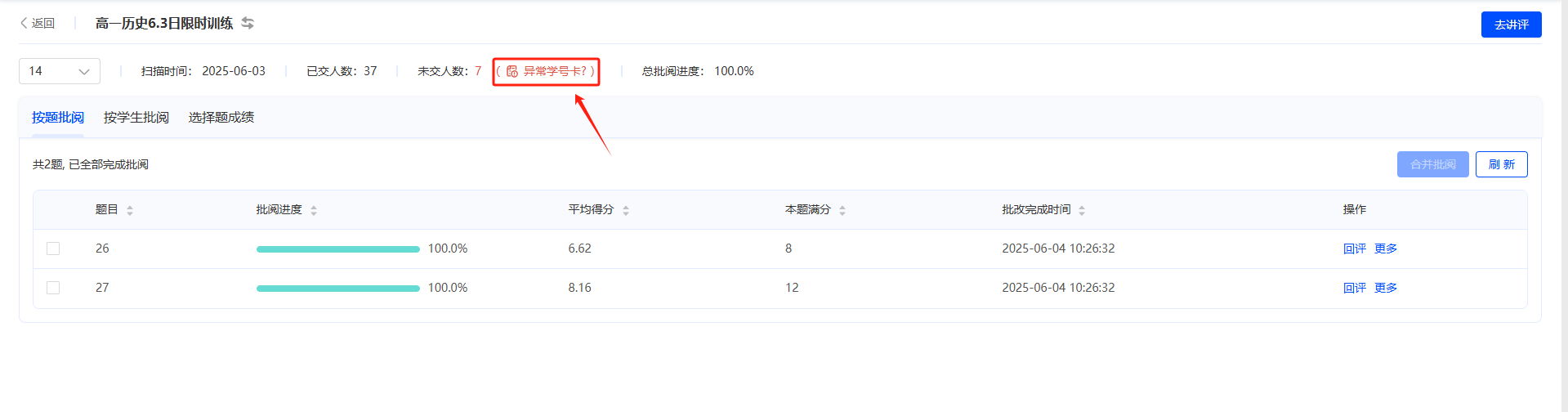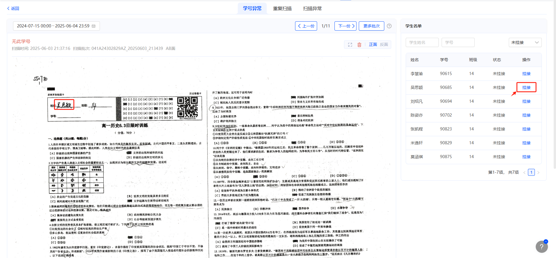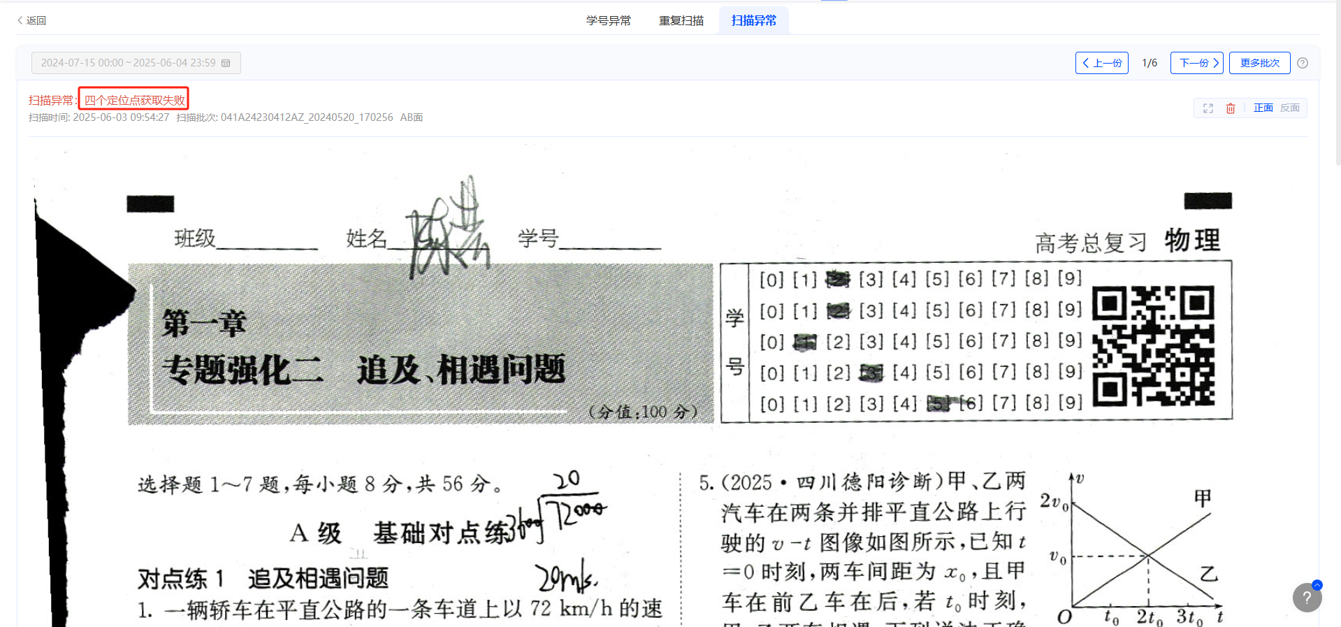 页面,可预览由于题卡二维码、定位点、页码点等被污损导致的异常题卡,该异常题卡无法正常挂接给学生,可通过重新扫描的方式再次上传;