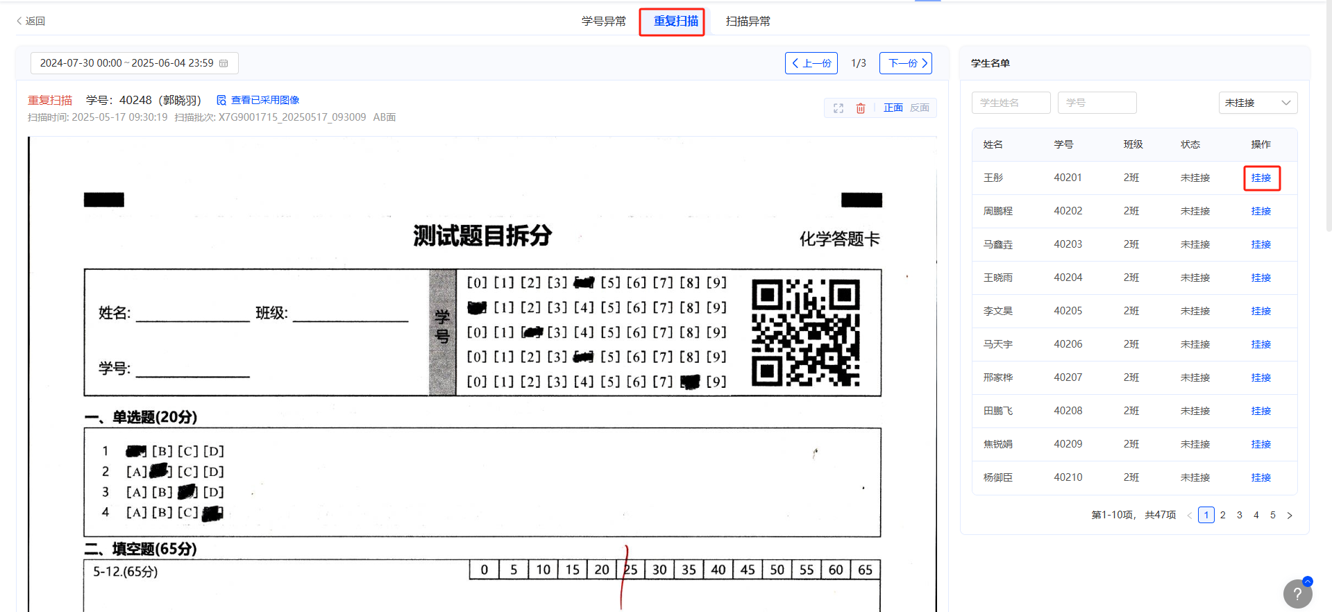 页面,可将学号和其他学生填涂重复的题卡,挂接到正确的学生上;