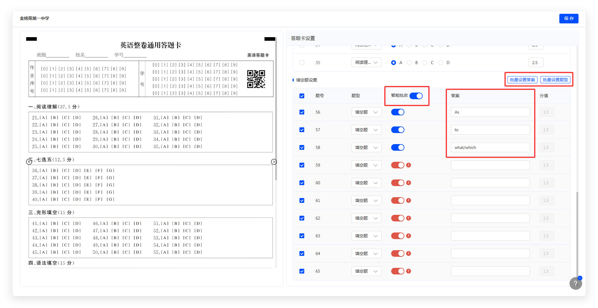 针对英语答题卡,如题卡中含有智能批改的填空题,需要开启智批并设置填空题答案。