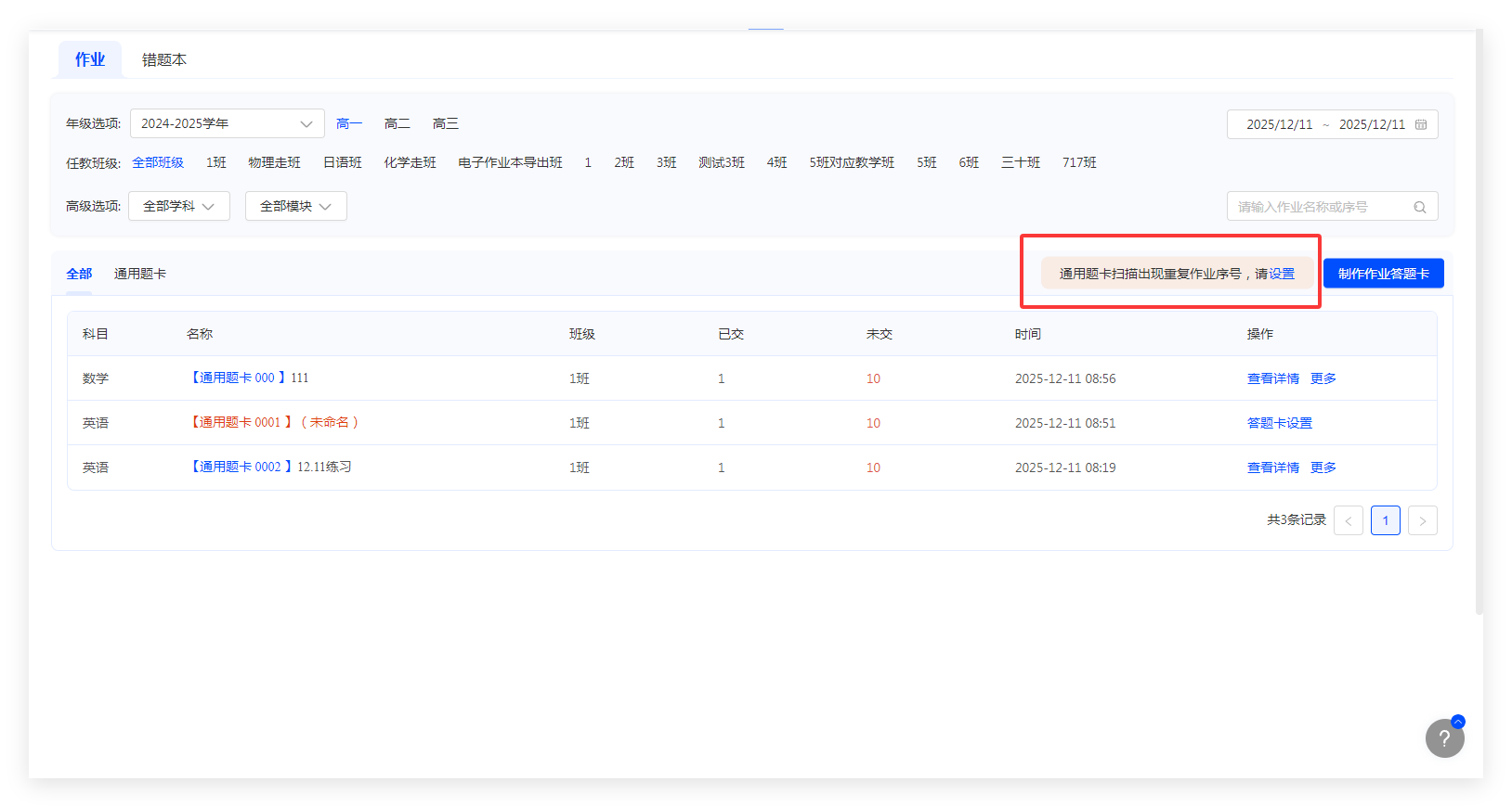 扫描通用答题卡后,在作业列表中默认显示的作业名称为系统默认配置的答题卡名称,点击【答题卡设置】,可设置作业名称、答案、分值等相关信息,具体操作说明如下:
