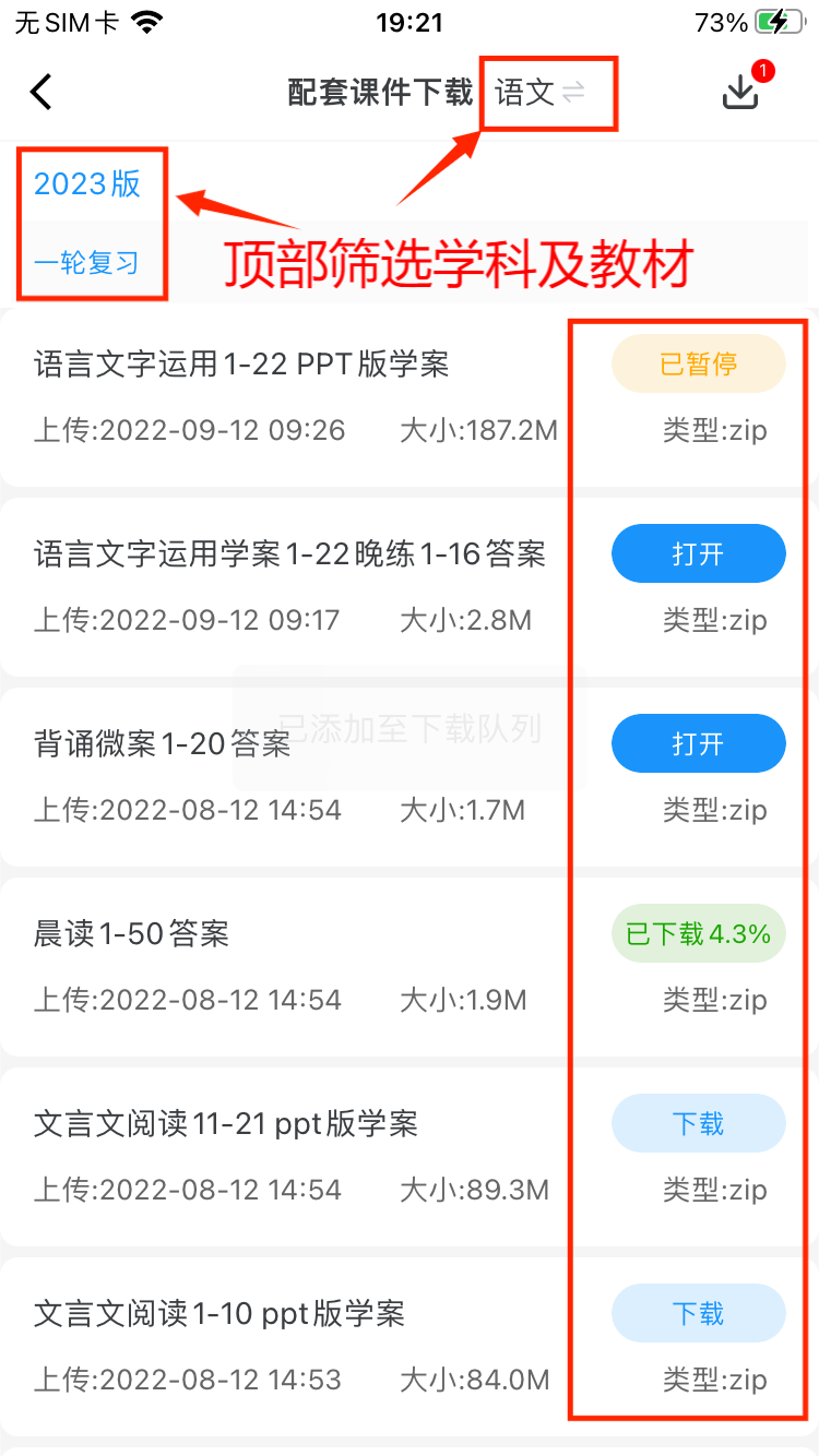在配套课件下载列表中,点击右上角的【下载】图标;进入下载管理页面;