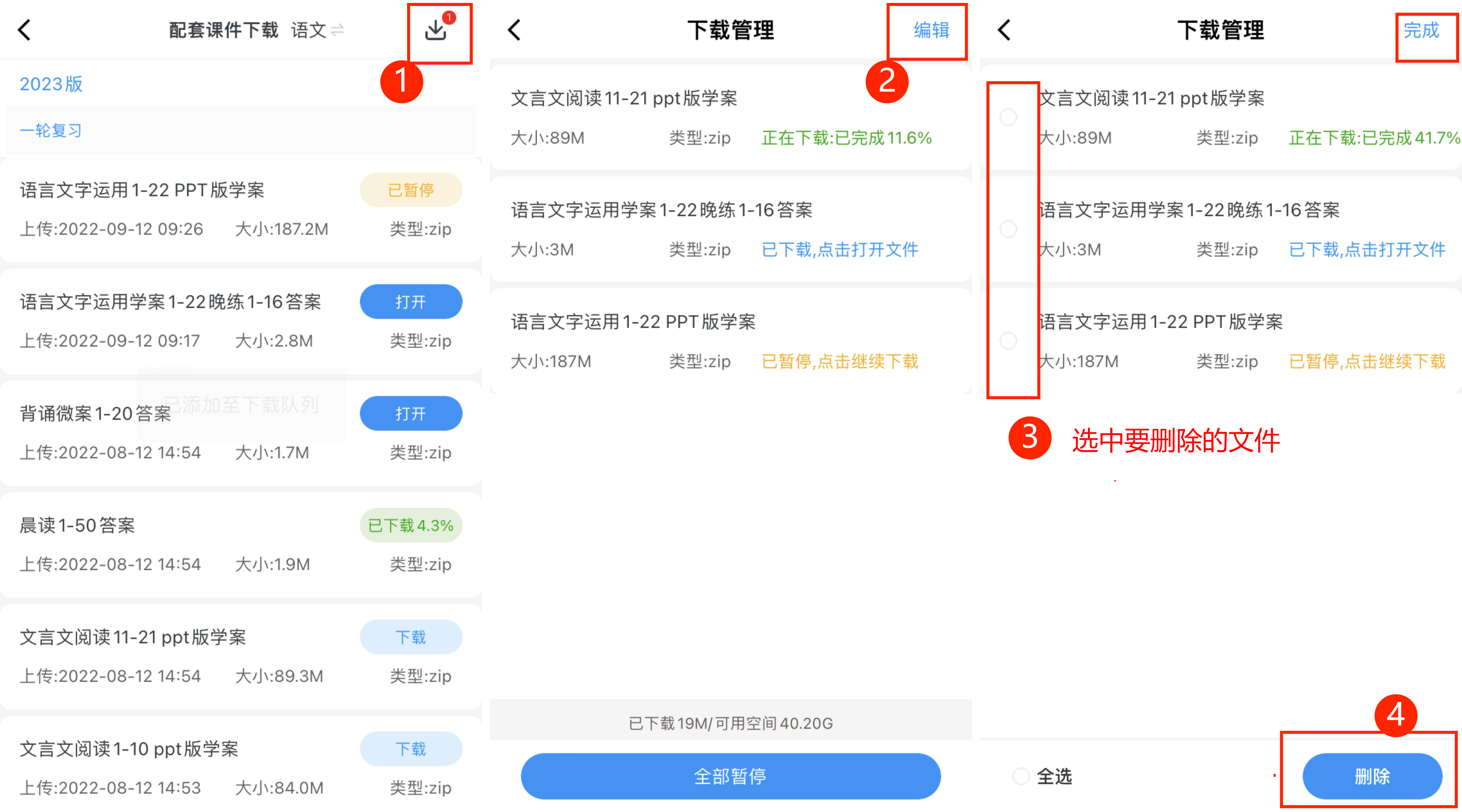 在下载管理页面,点击右上角的【编辑】,即可选择不需要的文件批量删除;