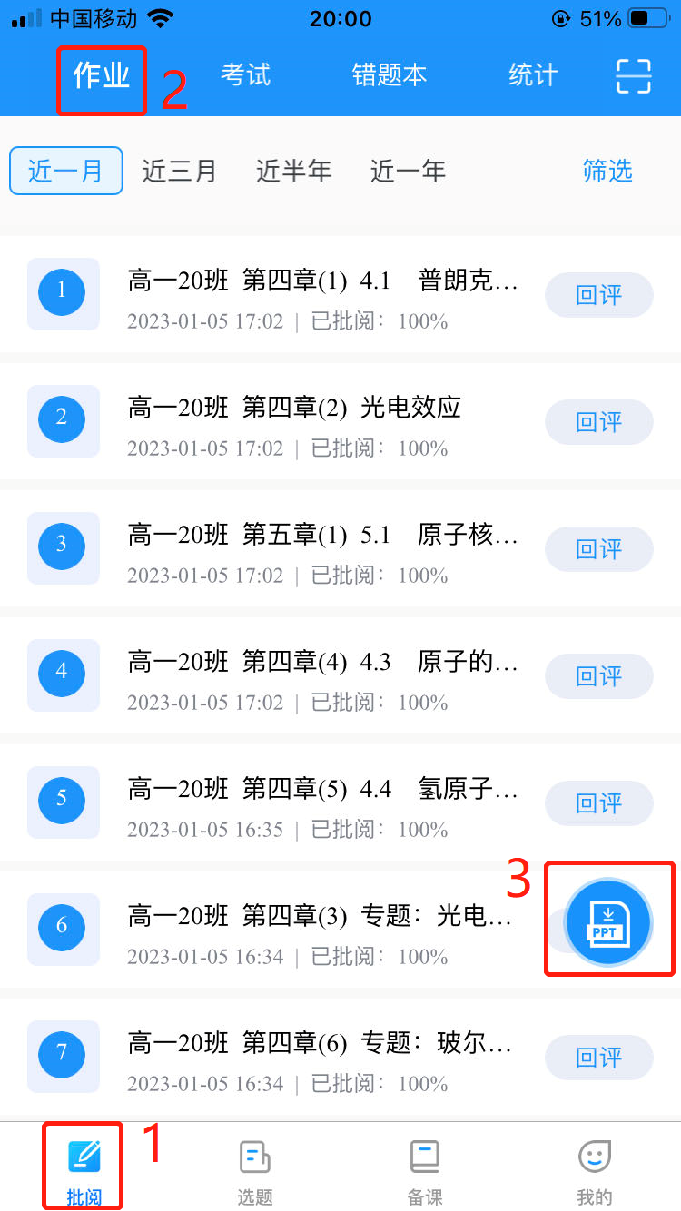路径:点击底部导航栏【批阅】-->顶部导航【作业】,页面右下角有个悬浮图标PPT;