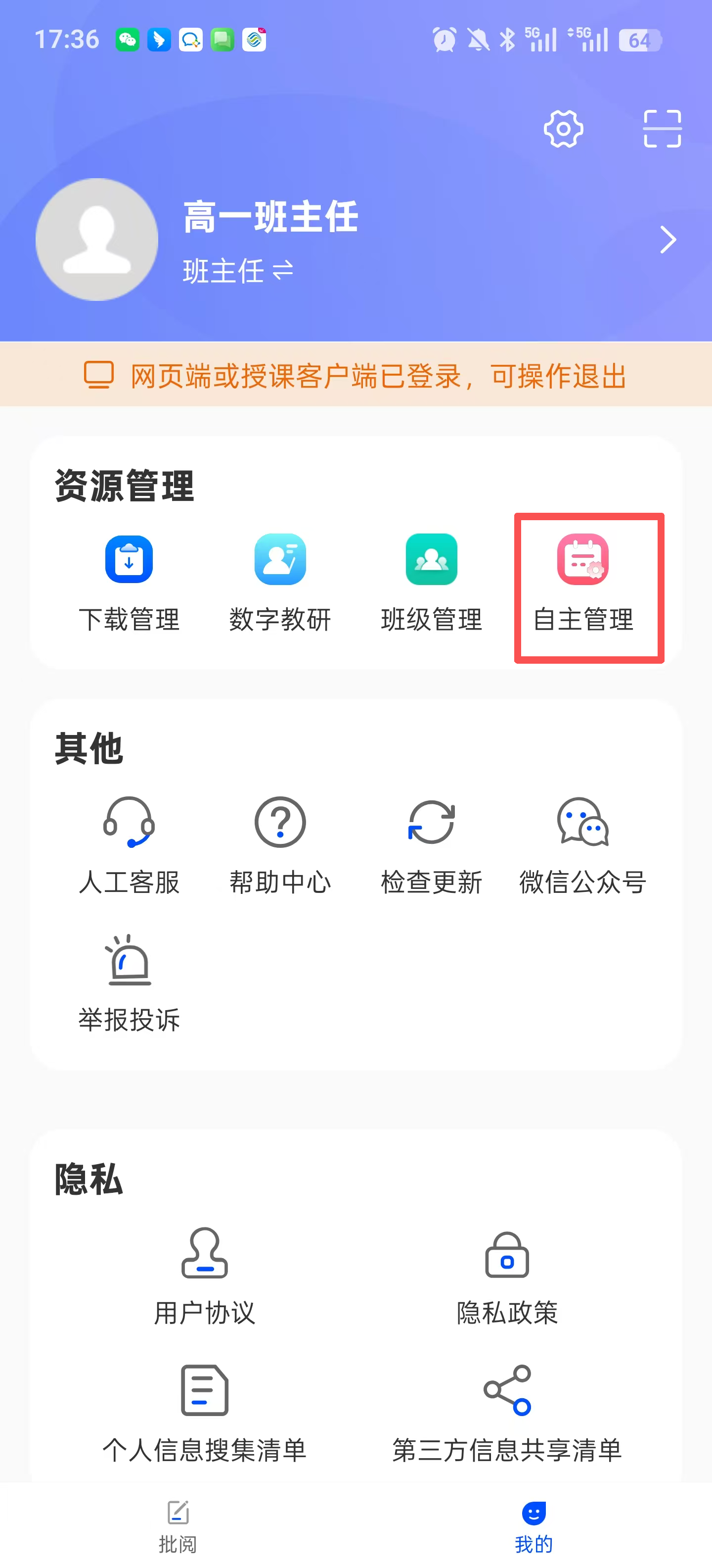 2.路径:我的-->自主管理