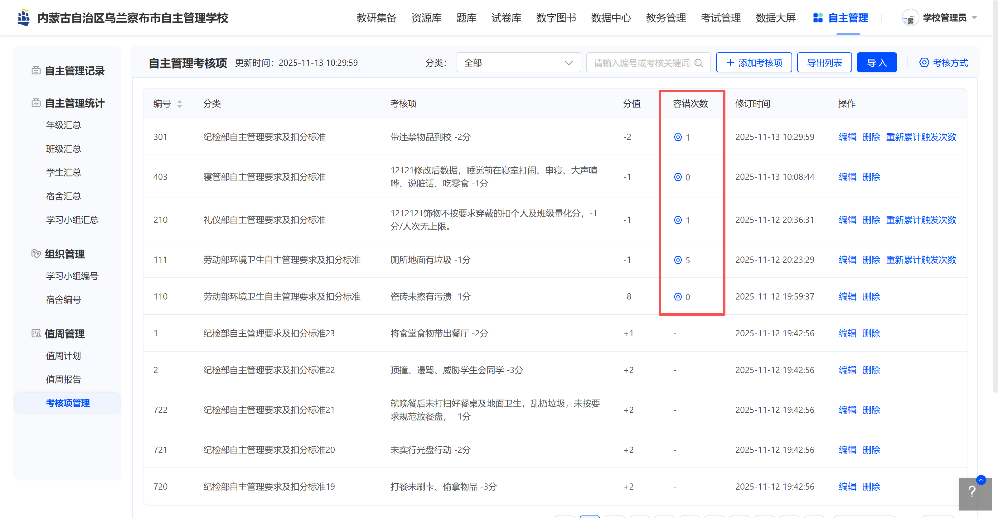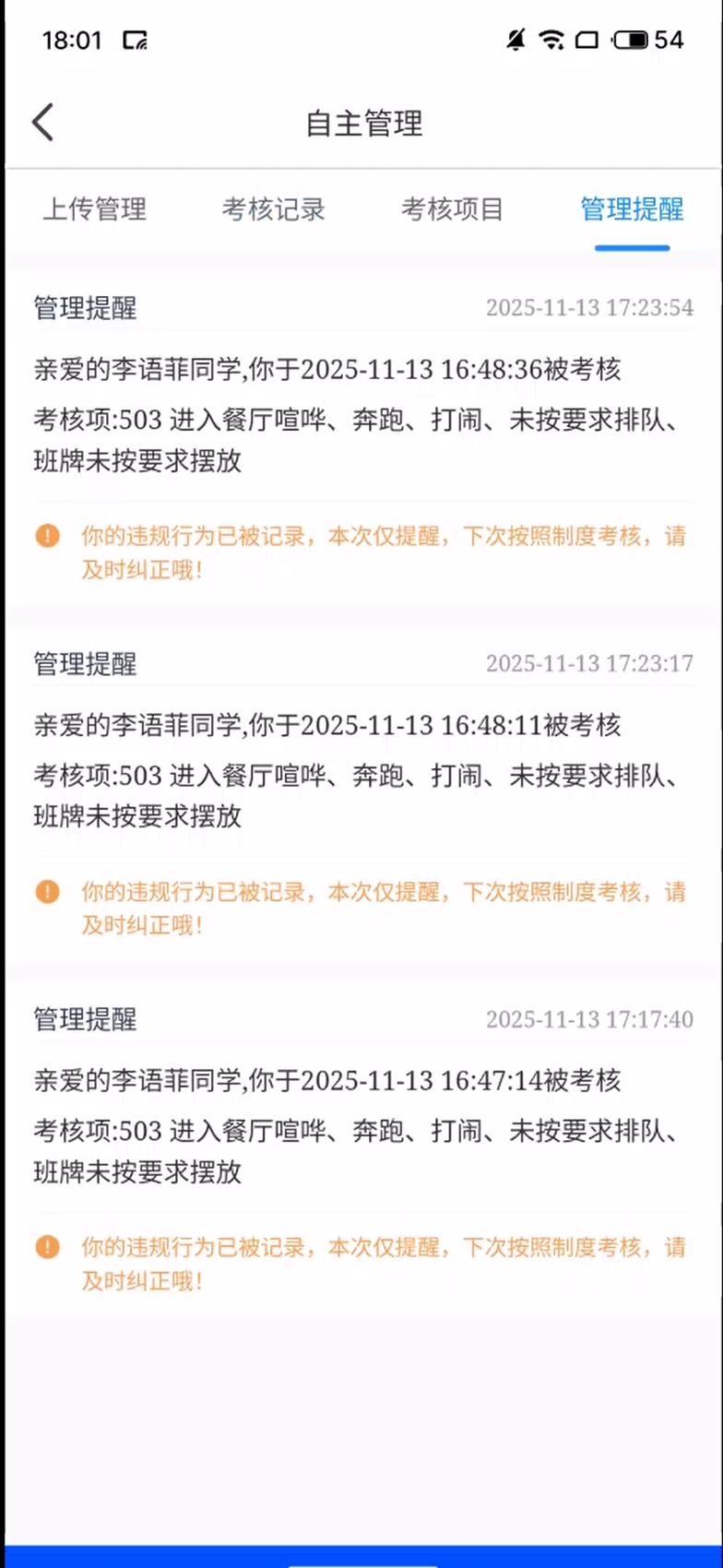 【容错次数】即当扣分的考核项发生在学生个体时,可以对学生设置容错次数;学生犯错次数在容错次数范围内时,不扣分,且在学生端APP中可以看到【管理提醒】;