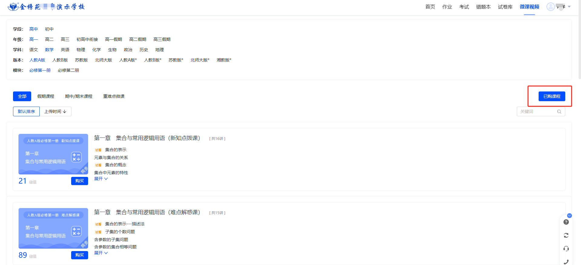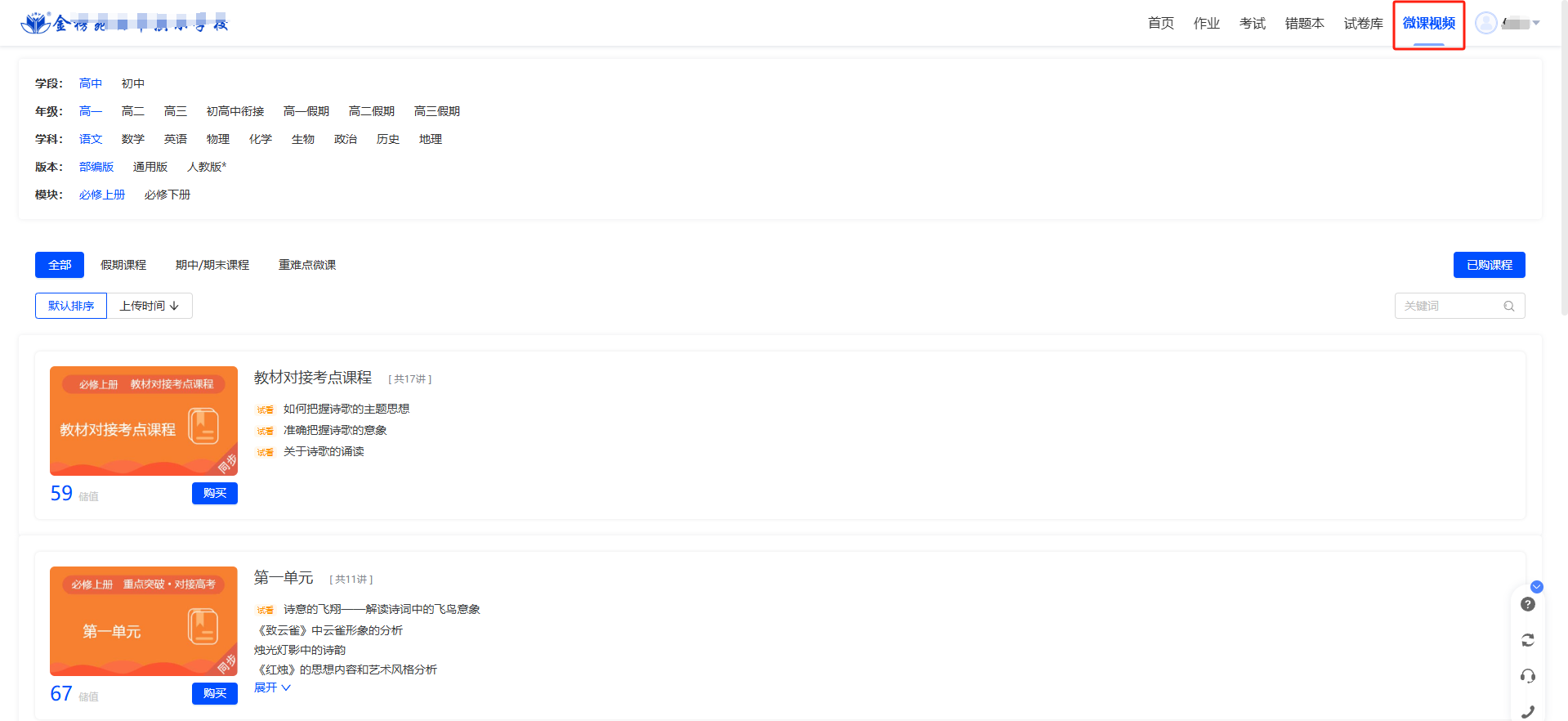 路径:点击【微课视频】,即可根据高中各年级、学科、教材版本及模块的筛选,选择下面的视频列表;
