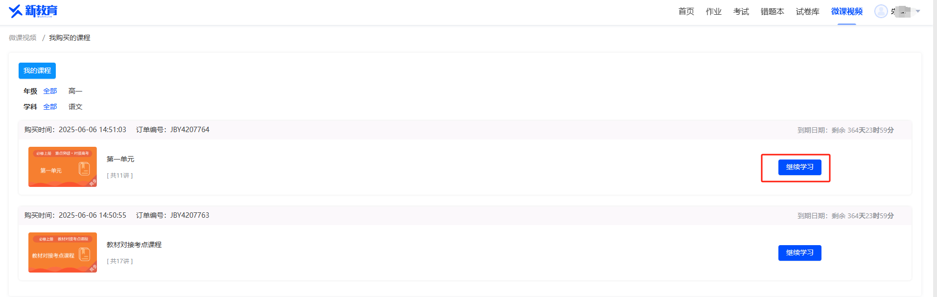 在“我购买的课程”页面中,可以筛选学科;点击视频列表的右侧【继续学习】即可进入视频页面;