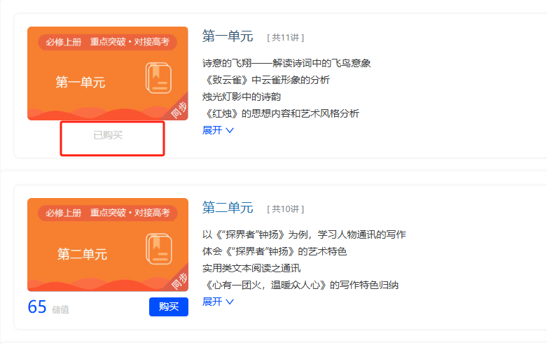 若已购买,在视频列表中会显示“已购买”的字样,并且不再显示【购买】的按钮;