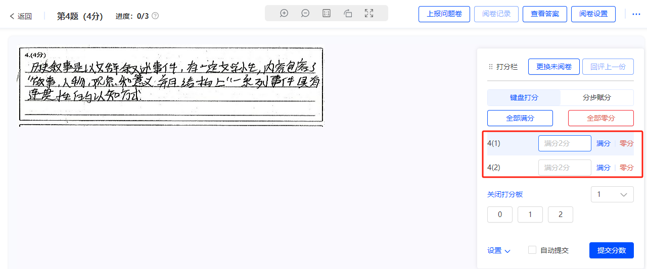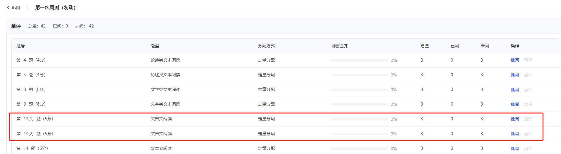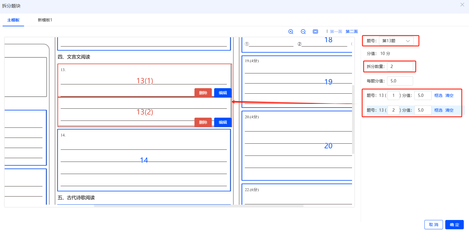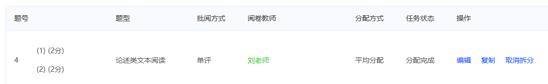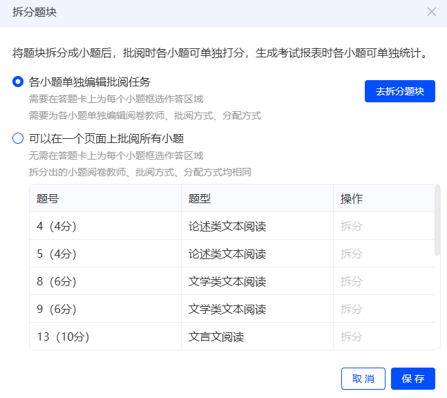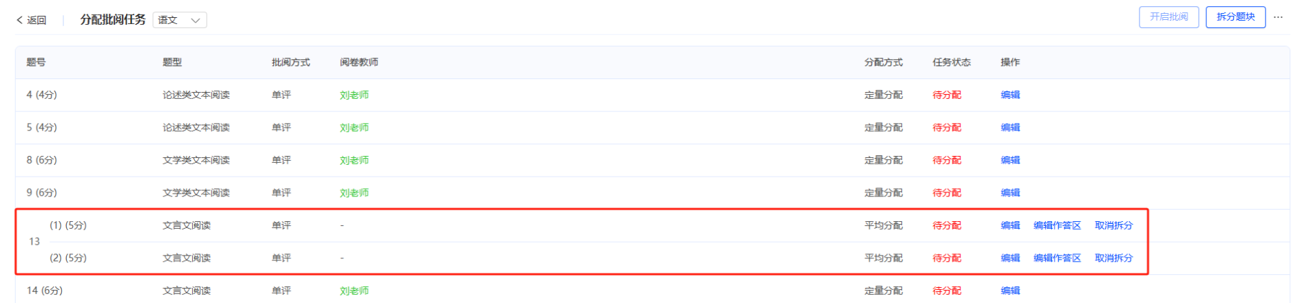 如若一道大题需要拆分开批阅,即按小题批阅,此时需要对答题卡进行题块拆分,拆分后再进行任务分配。