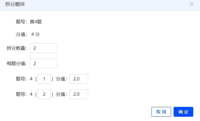 点击题号后的【拆分】按钮,显示如下页面,输入拆分数量和各小题的分值即可。