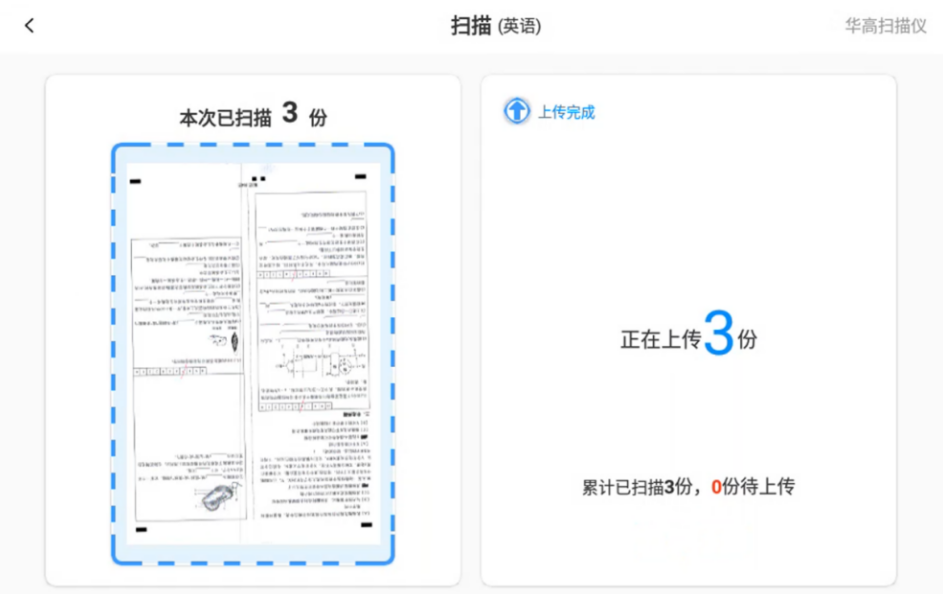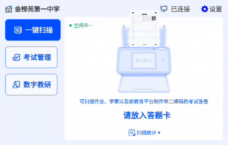 在新教育A3一体机式扫描仪上,打开新教育扫描端,若答题卡带有二维码,可使用一键扫描功能,自动上传到对应的考试科目中。