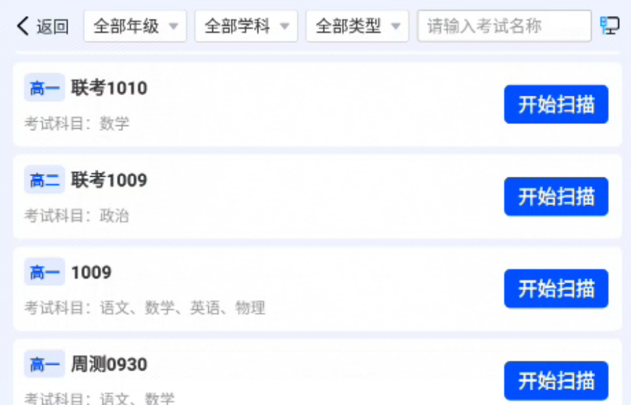 若答题卡没有勾选二维码,或使用三方题卡,需要点击【考试管理】,找到需要扫描题卡的考试,点击【开始扫描】按钮,进入待扫描学科列表页。