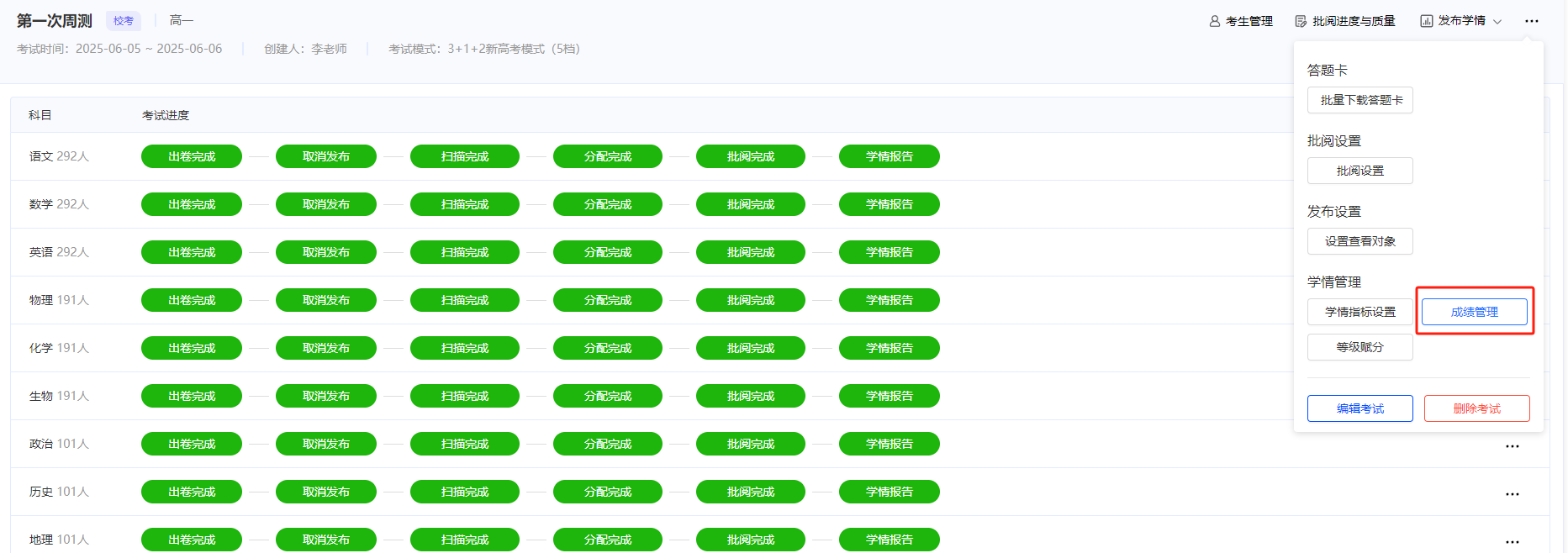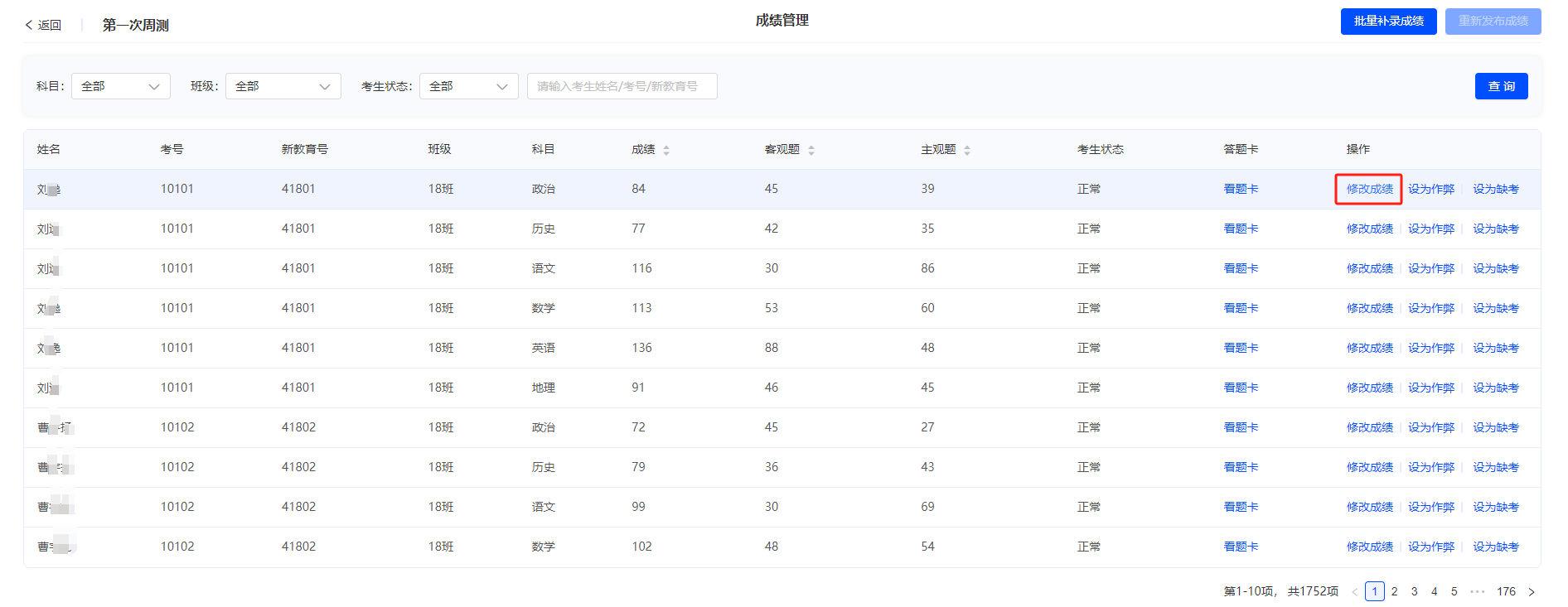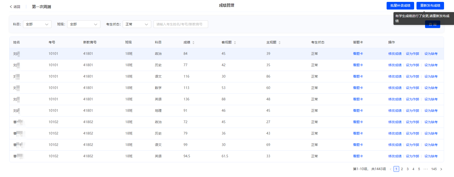 学生成绩有变更时,比如进行了成绩修改、补录或者设置作弊,“重新发布成绩”按钮会高亮显示,需要重新发布成绩。