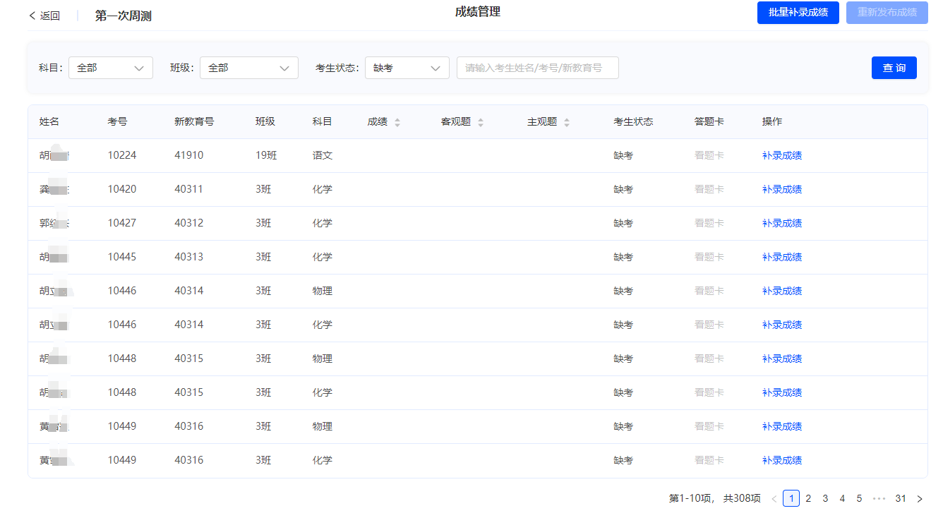 可以对缺考学生的成绩进行补录,在“考试管理→成绩分析→成绩管理”中,筛选考生状态是“缺考”的学生,点击【补录成绩】进入补录成绩详情页。