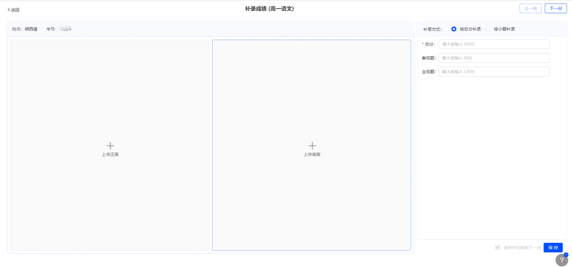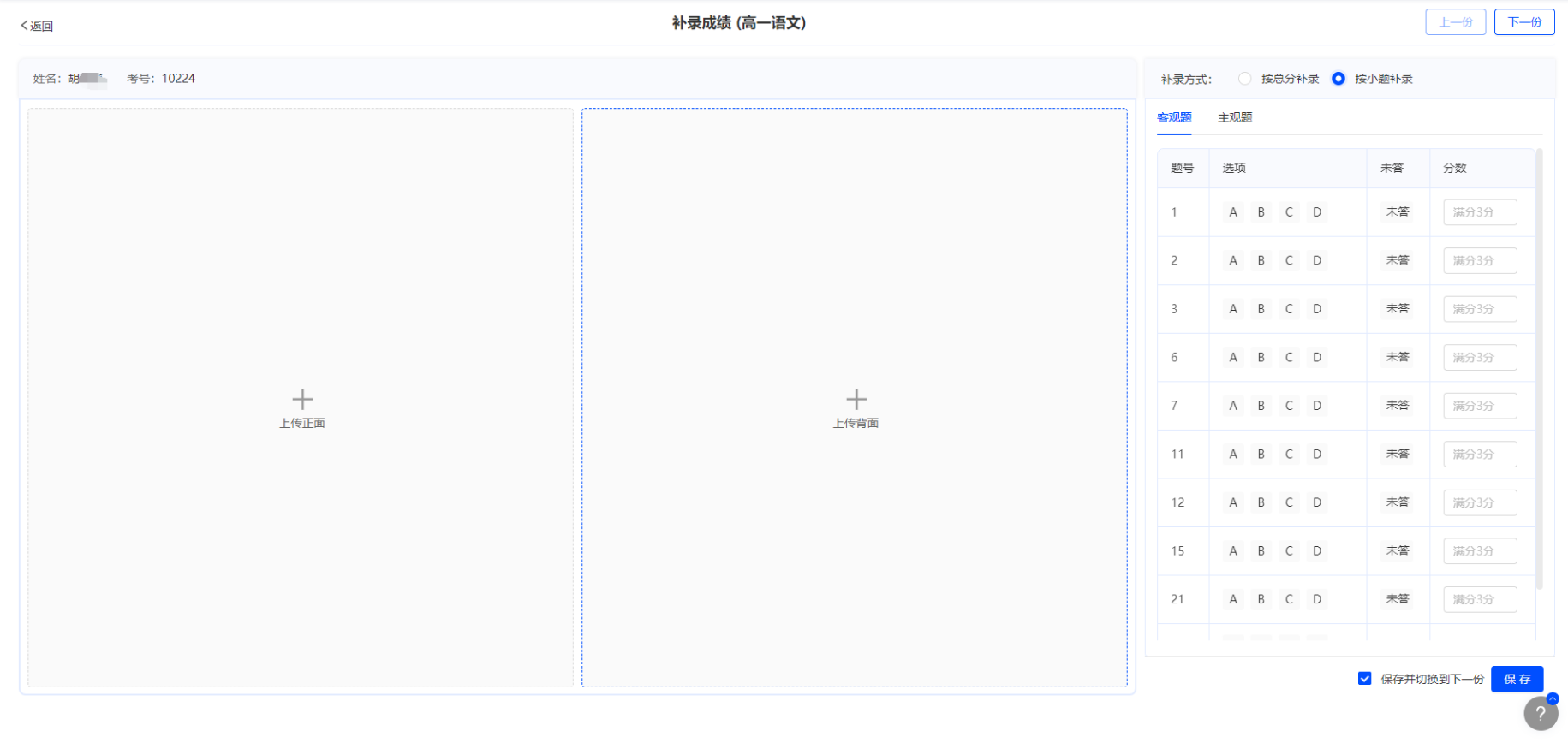 如需要将试卷各小题得分都输入,切换到“按小题补录”,可以输入客观题选项和主观题各小题分值及图片上传。