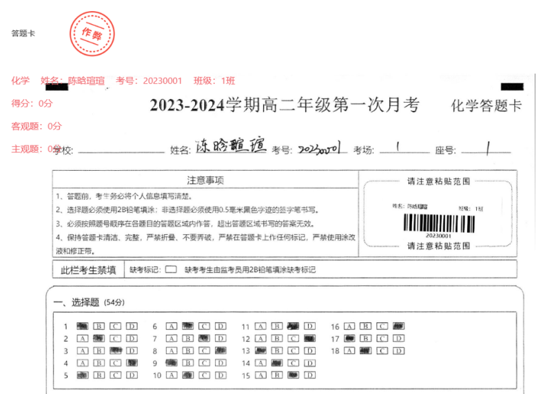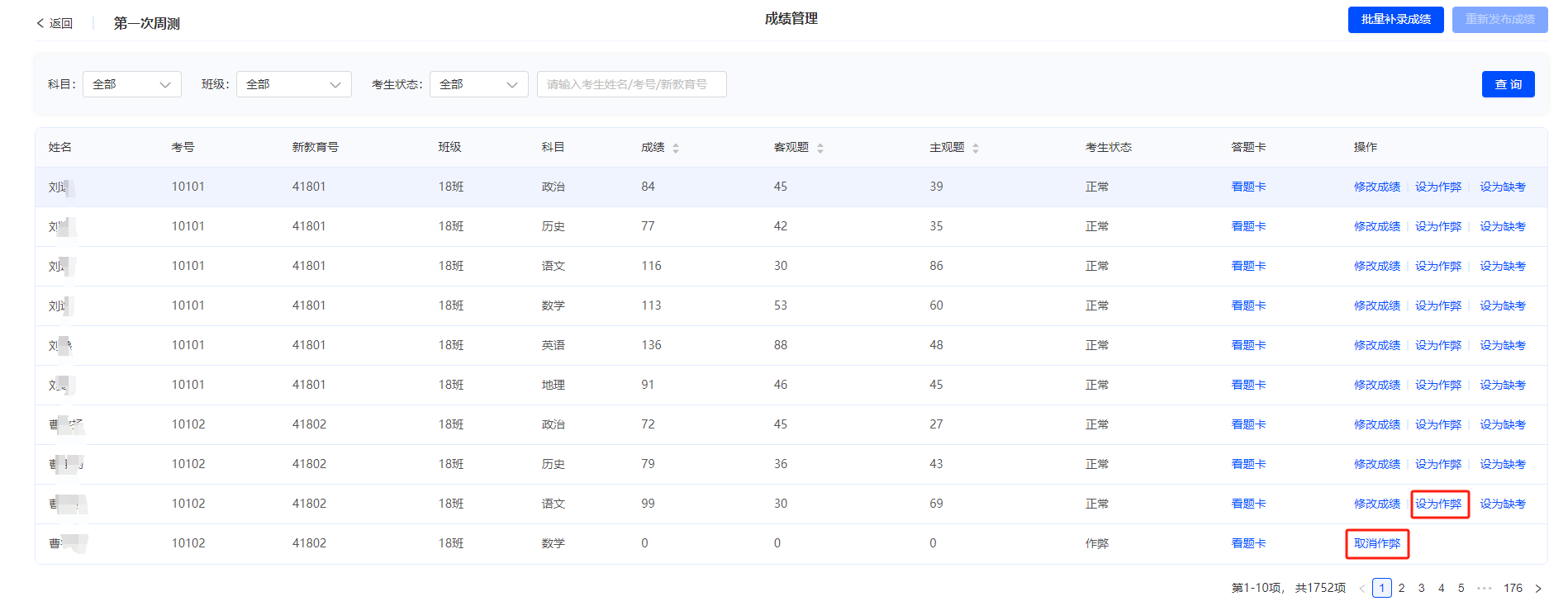 将客观题选项输入,系统会根据录入的选项自动计算出成绩,再将主观题分值录入、主观题小题图片上传。也可以将作弊的学生设置为作弊,设置后,成绩报表中该学生作弊的学科将会显示作弊状态。
