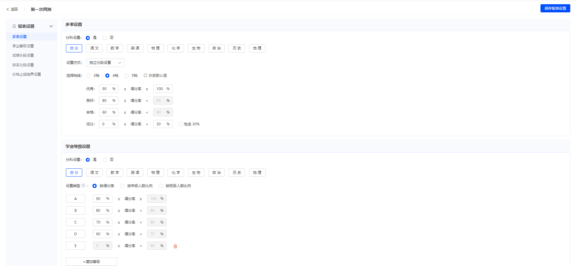 在“校级报告”页面点击【批量设置】按钮,可进行多率设置、成绩分段设置、名次段设置和分档上线临界设置,修改后无需重新发布成绩,保存后即可生效。
