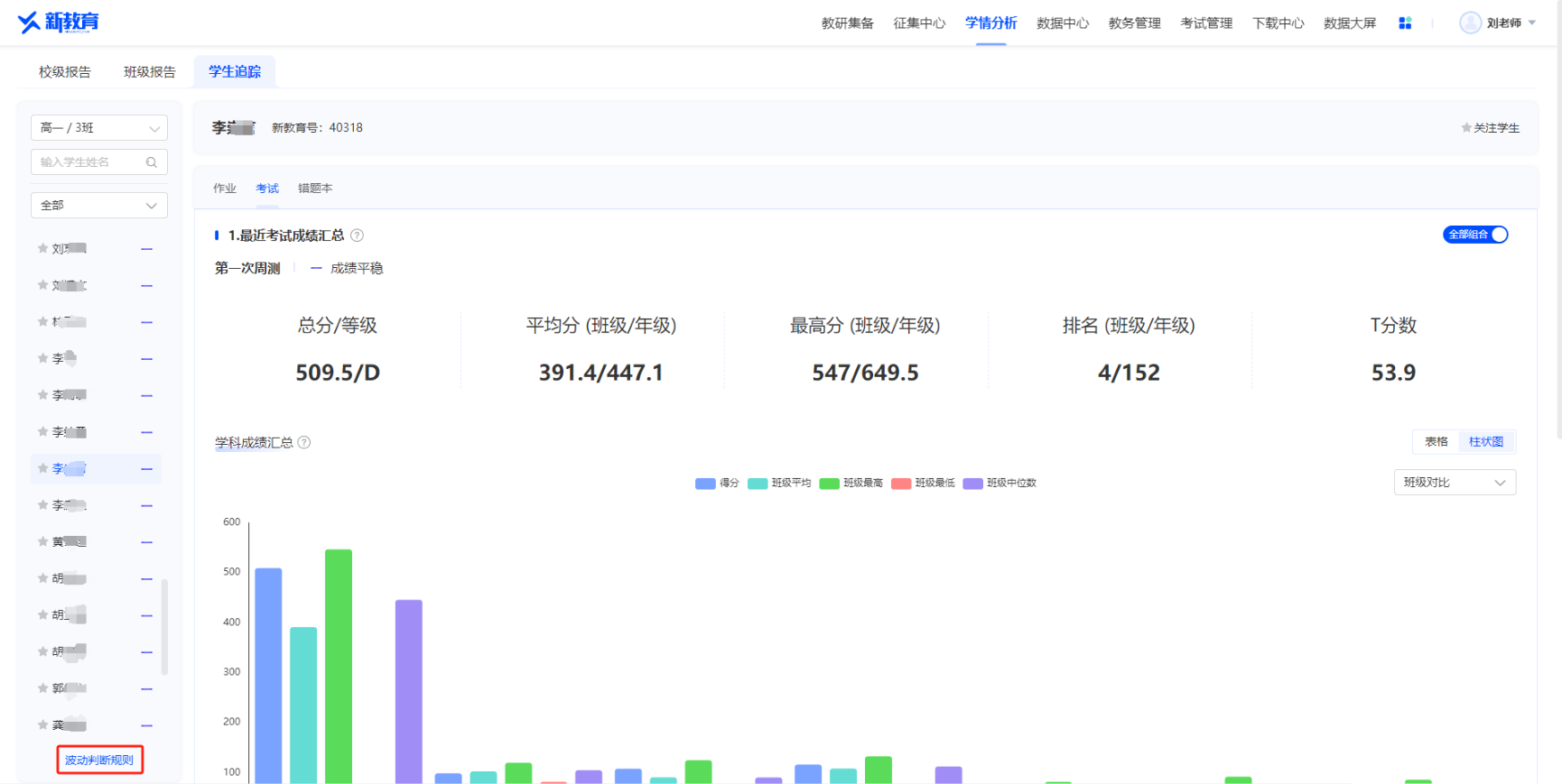 “学生追踪”页面,以学生维度分析每个学生的考试状况,比如历次考试得分波动情况、各学科成绩汇总等。