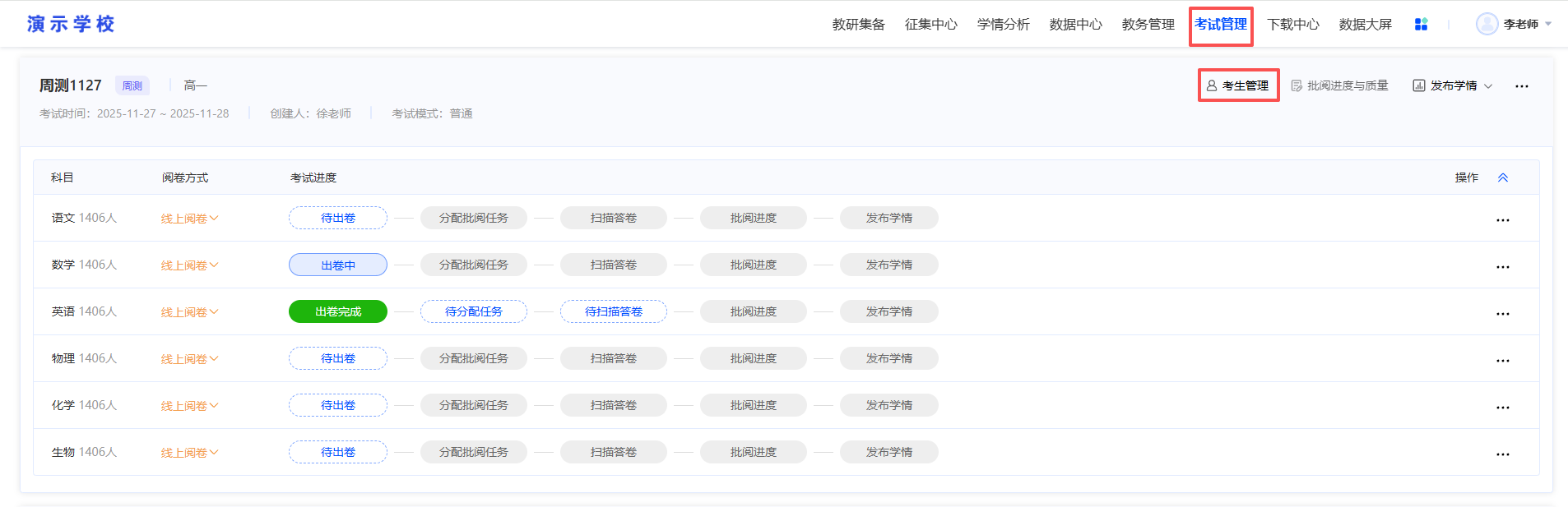 路径:点击“考试管理-->考生管理”,进入“考生管理”页面;
