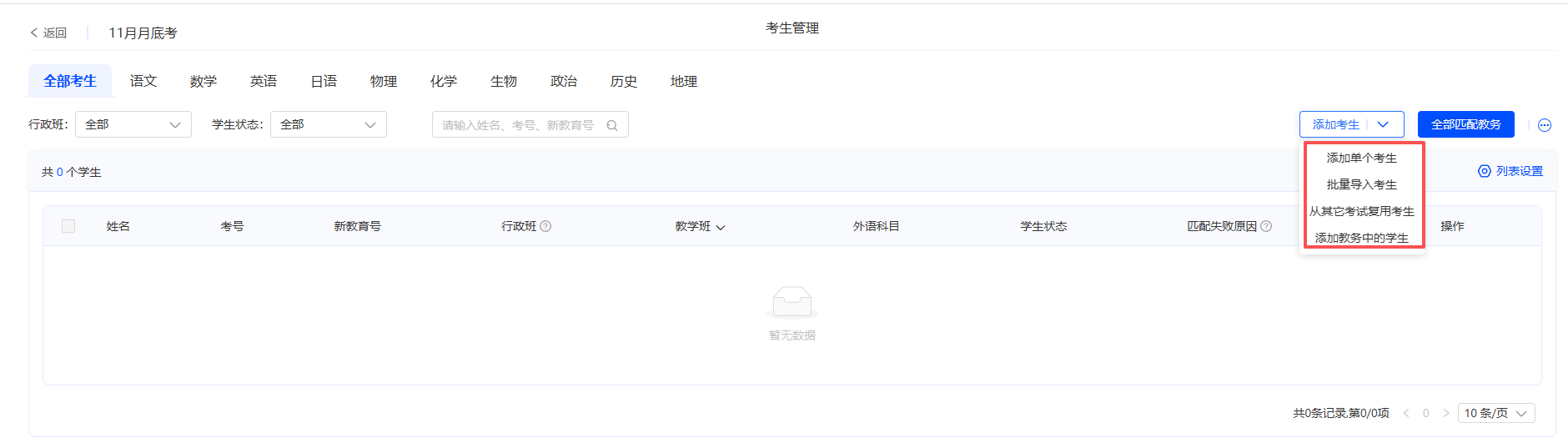 考生上传有四种方式可选:【添加单个考生】、【批量导入考生】、【从其它考试复用考生】和【添加教务中的考生】。