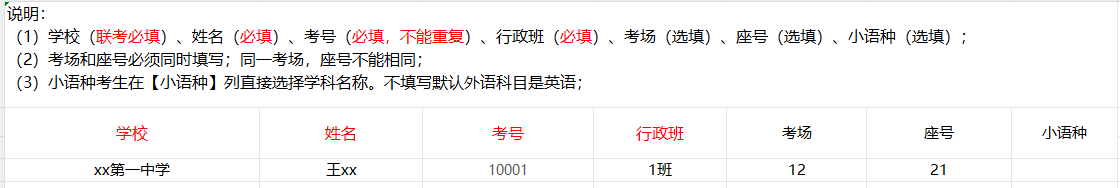 点击【批量导入考生】,下载模板,按照模板的要求录入考生,然后将文件导入。