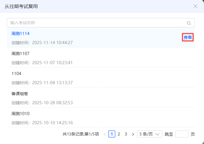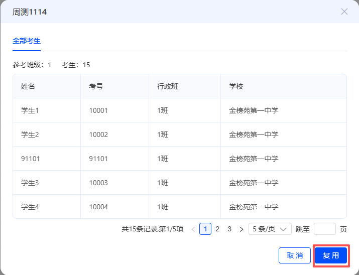 找到复用考号的往期考试,点击【查看】,核对考生后,点击【复用】按钮
