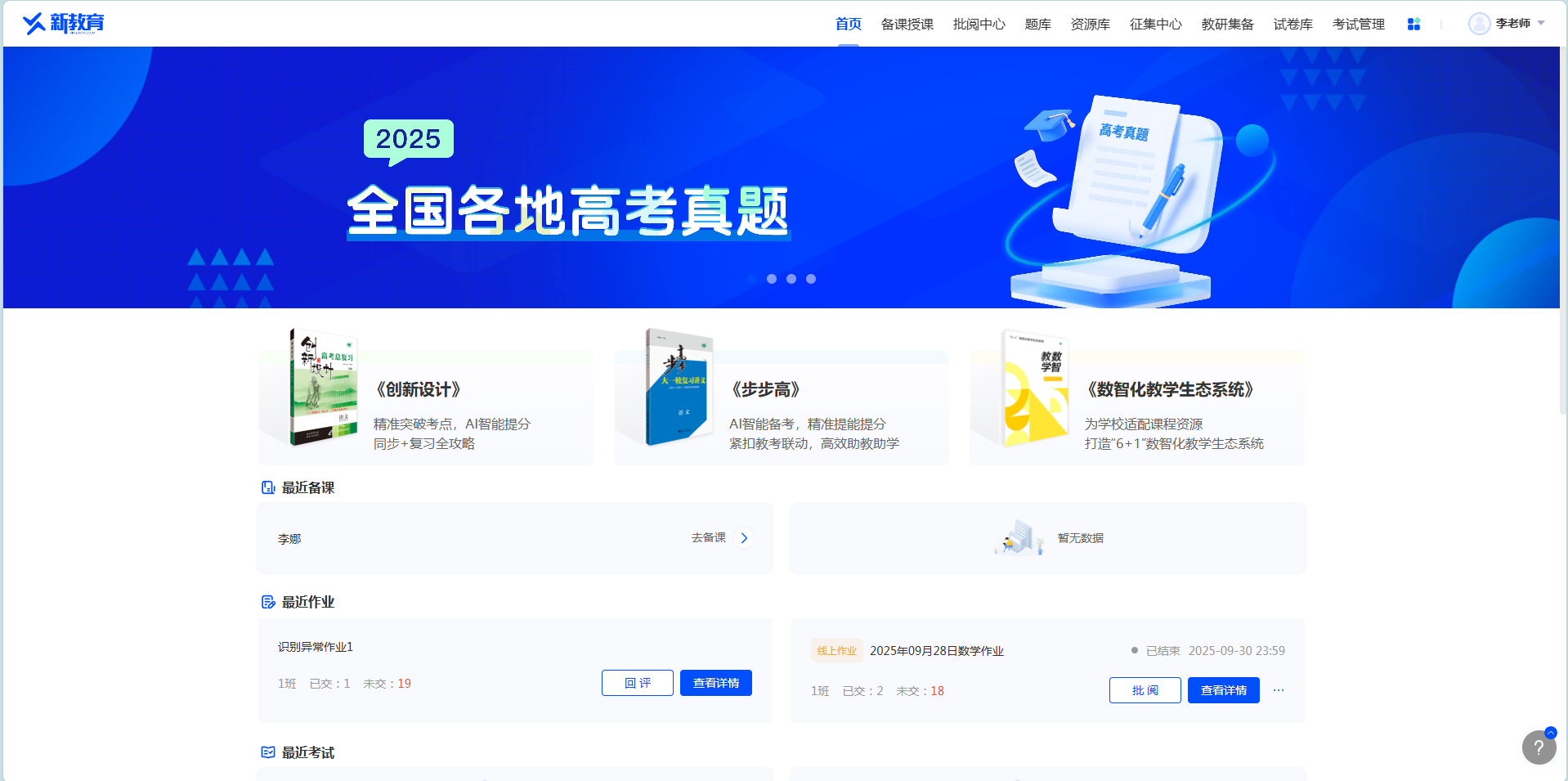 【批阅中心】为教师提供作业及考试的批改及批改记录;还统计了学生的答题情况及错题情况;
